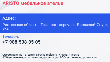 ARISTO, мебельное ателье по адресу Ростовская область, Таганрог, переулок Биржевой Спуск, 8/2 в дальнейшем Организация, размещена в следующих категориях: