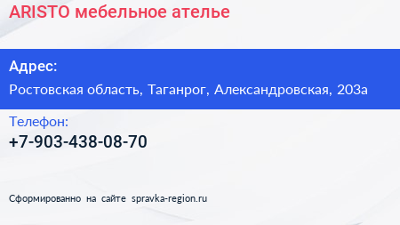 ARISTO, мебельное ателье по адресу Ростовская область, Таганрог, Александровская, 203а в дальнейшем Организация, размещена в следующих категориях: