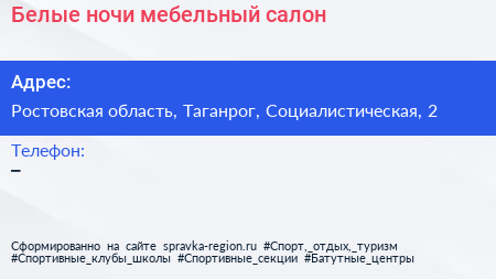 Белые ночи, мебельный салон по адресу Ростовская область, Таганрог, Социалистическая, 2 в дальнейшем Организация, размещена в следующих категориях: