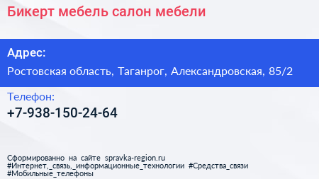 Бикерт-мебель, салон мебели по адресу Ростовская область, Таганрог, Александровская, 85/2 в дальнейшем Организация, размещена в следующих категориях: