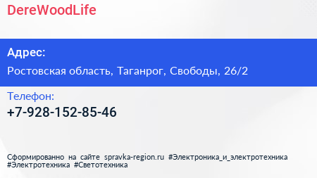 DereWoodLife по адресу Ростовская область, Таганрог, Свободы, 26/2 в дальнейшем Организация, размещена в следующих категориях: