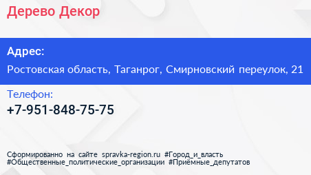 Дерево-Декор по адресу Ростовская область, Таганрог, Смирновский переулок, 21 в дальнейшем Организация, размещена в следующих категориях: