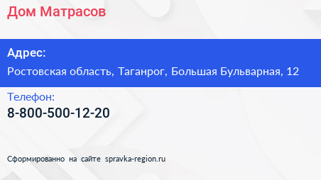 Дом Матрасов по адресу Ростовская область, Таганрог, Большая Бульварная, 12 в дальнейшем Организация, размещена в следующих категориях: