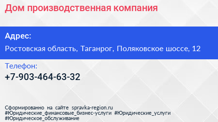 Дом, производственная компания по адресу Ростовская область, Таганрог, Поляковское шоссе, 12 в дальнейшем Организация, размещена в следующих категориях: