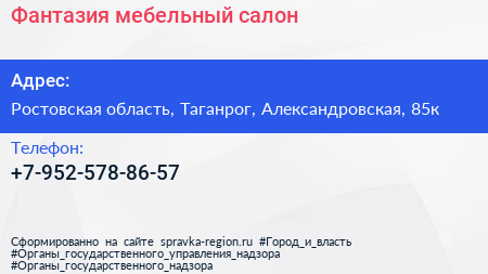 Фантазия, мебельный салон по адресу Ростовская область, Таганрог, Александровская, 85к в дальнейшем Организация, размещена в следующих категориях: