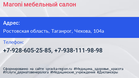 Maroni, мебельный салон по адресу Ростовская область, Таганрог, Чехова, 104а в дальнейшем Организация, размещена в следующих категориях: