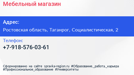 Мебельный магазин по адресу Ростовская область, Таганрог, Социалистическая, 2 в дальнейшем Организация, размещена в следующих категориях: