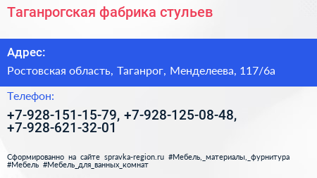 Таганрогская фабрика стульев по адресу Ростовская область, Таганрог, Менделеева, 117/6а в дальнейшем Организация, размещена в следующих категориях: