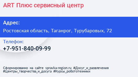 ART Плюс, сервисный центр по адресу Ростовская область, Таганрог, Турубаровых, 72 в дальнейшем Организация, размещена в следующих категориях: