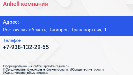 Anhell, компания по адресу Ростовская область, Таганрог, Транспортная, 1 в дальнейшем Организация, размещена в следующих категориях: