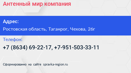 Антенный мир, компания по адресу Ростовская область, Таганрог, Чехова, 26г в дальнейшем Организация, размещена в следующих категориях: