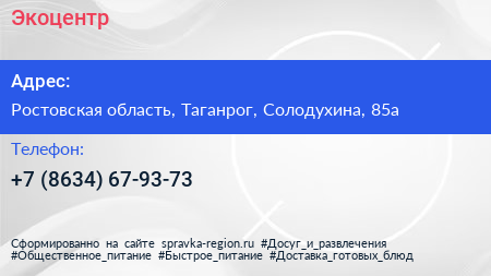 Экоцентр по адресу Ростовская область, Таганрог, Солодухина, 85а в дальнейшем Организация, размещена в следующих категориях: