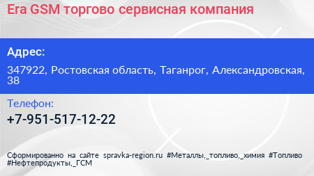 Era GSM, торгово-сервисная компания по адресу 347922, Ростовская область, Таганрог, Александровская, 38 в дальнейшем Организация, размещена в следующих категориях: