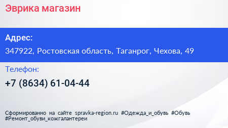 Эврика, магазин по адресу 347922, Ростовская область, Таганрог, Чехова, 49 в дальнейшем Организация, размещена в следующих категориях: