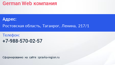 German Web, компания по адресу Ростовская область, Таганрог, Ленина, 217/1 в дальнейшем Организация, размещена в следующих категориях: