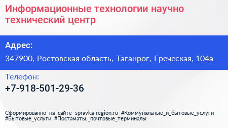 Информационные технологии, научно-технический центр по адресу 347900, Ростовская область, Таганрог, Греческая, 104а в дальнейшем Организация, размещена в следующих категориях: