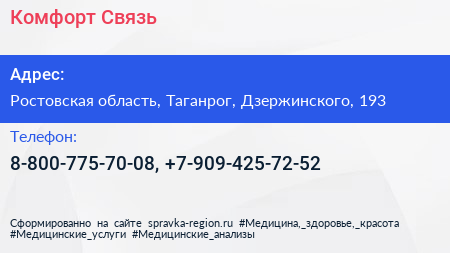 Комфорт-Связь по адресу Ростовская область, Таганрог, Дзержинского, 193 в дальнейшем Организация, размещена в следующих категориях: