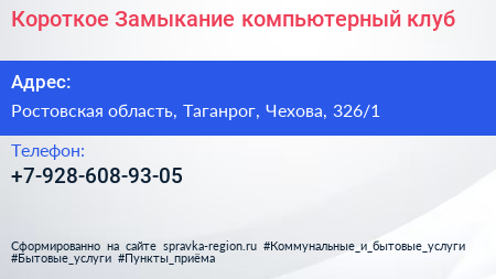 Короткое Замыкание, компьютерный клуб по адресу Ростовская область, Таганрог, Чехова, 326/1 в дальнейшем Организация, размещена в следующих категориях:
