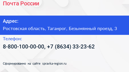 Почта России по адресу Ростовская область, Таганрог, Безымянный проезд, 3 в дальнейшем Организация, размещена в следующих категориях: