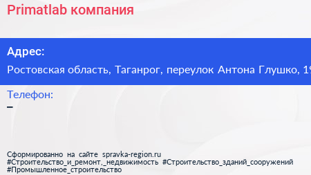 Primatlab, компания по адресу Ростовская область, Таганрог, переулок Антона Глушко, 19 в дальнейшем Организация, размещена в следующих категориях: