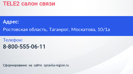 TELE2, салон связи по адресу Ростовская область, Таганрог, Москатова, 10/1а в дальнейшем Организация, размещена в следующих категориях:
