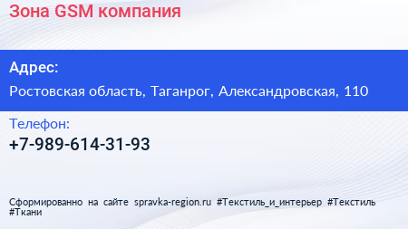 Зона GSM, компания по адресу Ростовская область, Таганрог, Александровская, 110 в дальнейшем Организация, размещена в следующих категориях: