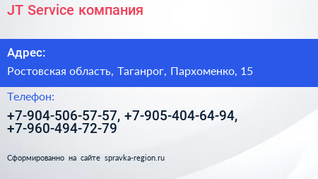 JT Service, компания по адресу Ростовская область, Таганрог, Пархоменко, 15 в дальнейшем Организация, размещена в следующих категориях: