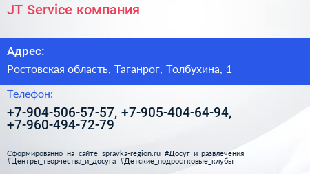 JT Service, компания по адресу Ростовская область, Таганрог, Толбухина, 1 в дальнейшем Организация, размещена в следующих категориях: