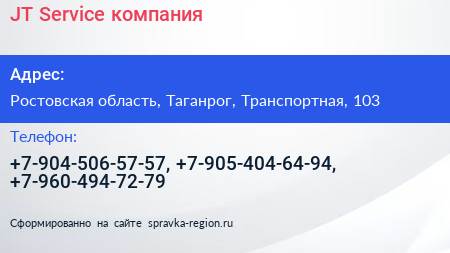 JT Service, компания по адресу Ростовская область, Таганрог, Транспортная, 103 в дальнейшем Организация, размещена в следующих категориях: