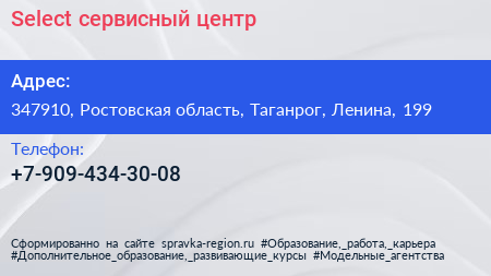 Select, сервисный центр по адресу 347910, Ростовская область, Таганрог, Ленина, 199 в дальнейшем Организация, размещена в следующих категориях: