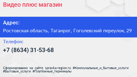 Видео-плюс, магазин по адресу Ростовская область, Таганрог, Гоголевский переулок, 29 в дальнейшем Организация, размещена в следующих категориях: