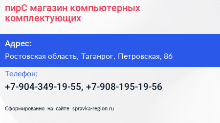 пирС, магазин компьютерных комплектующих по адресу Ростовская область, Таганрог, Петровская, 86 в дальнейшем Организация, размещена в следующих категориях: