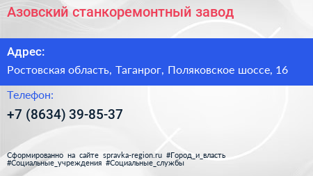 Азовский станкоремонтный завод по адресу Ростовская область, Таганрог, Поляковское шоссе, 16 в дальнейшем Организация, размещена в следующих категориях: