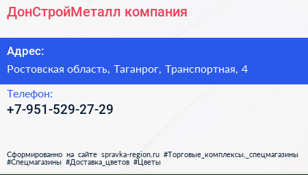 ДонСтройМеталл, компания по адресу Ростовская область, Таганрог, Транспортная, 4 в дальнейшем Организация, размещена в следующих категориях: