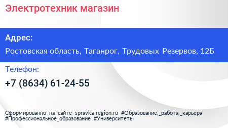 Электротехник, магазин по адресу Ростовская область, Таганрог, Трудовых Резервов, 12Б в дальнейшем Организация, размещена в следующих категориях: