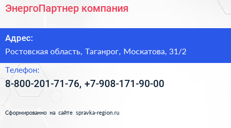ЭнергоПартнер, компания по адресу Ростовская область, Таганрог, Москатова, 31/2 в дальнейшем Организация, размещена в следующих категориях: