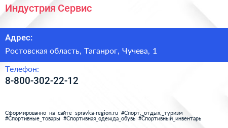 Индустрия Сервис по адресу Ростовская область, Таганрог, Чучева, 1 в дальнейшем Организация, размещена в следующих категориях: