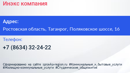 Инэкс, компания по адресу Ростовская область, Таганрог, Поляковское шоссе, 16 в дальнейшем Организация, размещена в следующих категориях:
