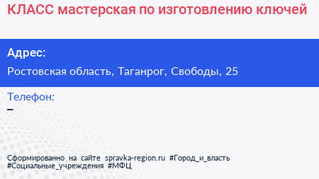 КЛАСС, мастерская по изготовлению ключей по адресу Ростовская область, Таганрог, Свободы, 25 в дальнейшем Организация, размещена в следующих категориях: