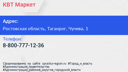 КВТ Маркет по адресу Ростовская область, Таганрог, Чучева, 1 в дальнейшем Организация, размещена в следующих категориях: