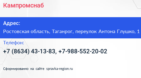 Кампромснаб по адресу Ростовская область, Таганрог, переулок Антона Глушко, 1 в дальнейшем Организация, размещена в следующих категориях: