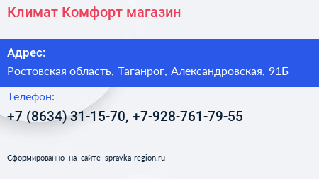 Климат Комфорт, магазин по адресу Ростовская область, Таганрог, Александровская, 91Б в дальнейшем Организация, размещена в следующих категориях: