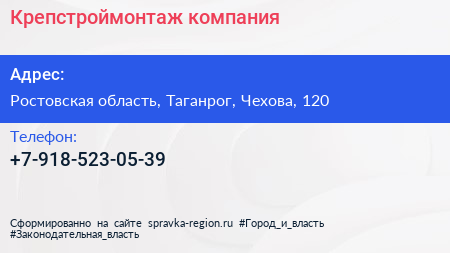 Крепстроймонтаж, компания по адресу Ростовская область, Таганрог, Чехова, 120 в дальнейшем Организация, размещена в следующих категориях:
