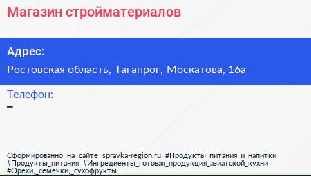 Магазин стройматериалов по адресу Ростовская область, Таганрог, Москатова, 16а в дальнейшем Организация, размещена в следующих категориях: