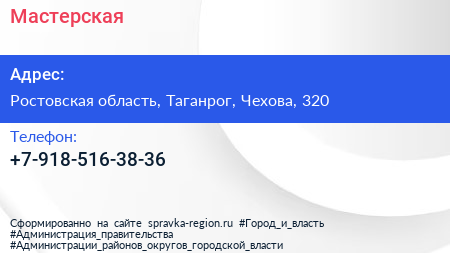 Мастерская по адресу Ростовская область, Таганрог, Чехова, 320 в дальнейшем Организация, размещена в следующих категориях: