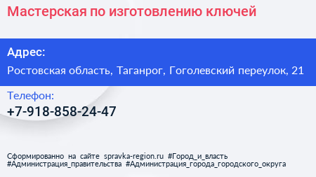 Мастерская по изготовлению ключей по адресу Ростовская область, Таганрог, Гоголевский переулок, 21 в дальнейшем Организация, размещена в следующих категориях: