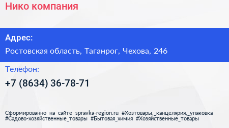 Нико, компания по адресу Ростовская область, Таганрог, Чехова, 246 в дальнейшем Организация, размещена в следующих категориях: