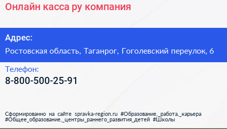 Онлайн-касса.ру, компания по адресу Ростовская область, Таганрог, Гоголевский переулок, 6 в дальнейшем Организация, размещена в следующих категориях: