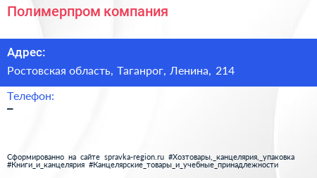 Полимерпром, компания по адресу Ростовская область, Таганрог, Ленина, 214 в дальнейшем Организация, размещена в следующих категориях: