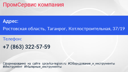 ПромСервис, компания по адресу Ростовская область, Таганрог, Котлостроительная, 37/19 в дальнейшем Организация, размещена в следующих категориях:
